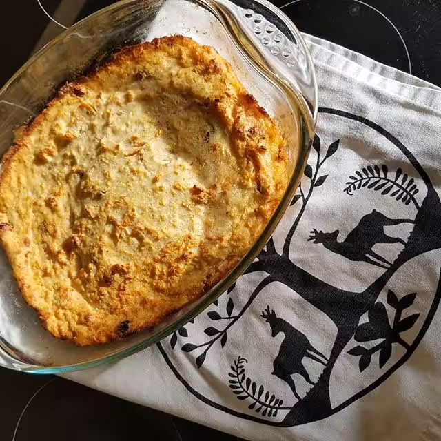 7. Anschließend in eine gefettete Auflaufform geben und im vorgeheizten Backofen 45 Min backen.