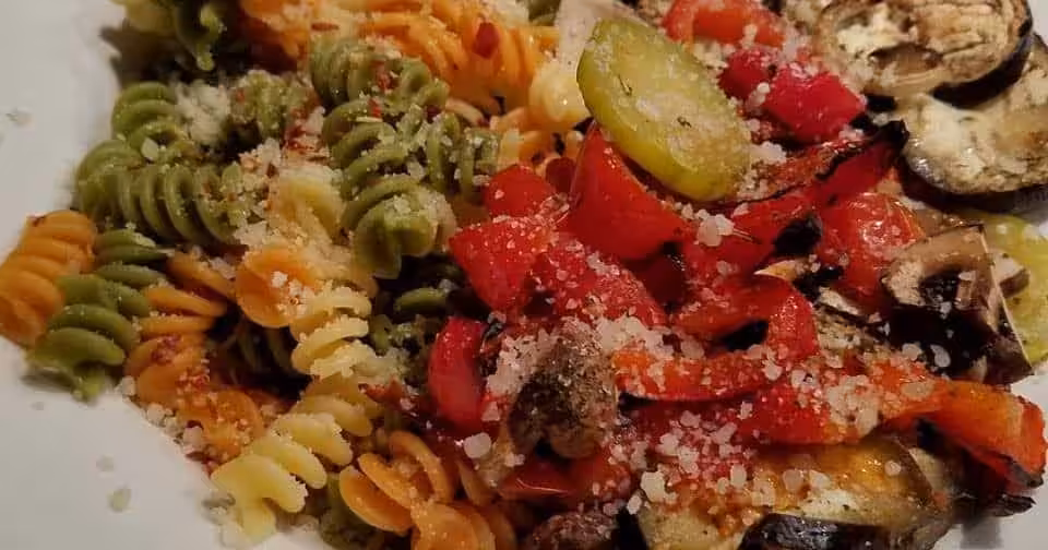 7. Richte die Pasta und das Gemüse auf einem Teller an und bestreue es mit geriebenem Parmesan.